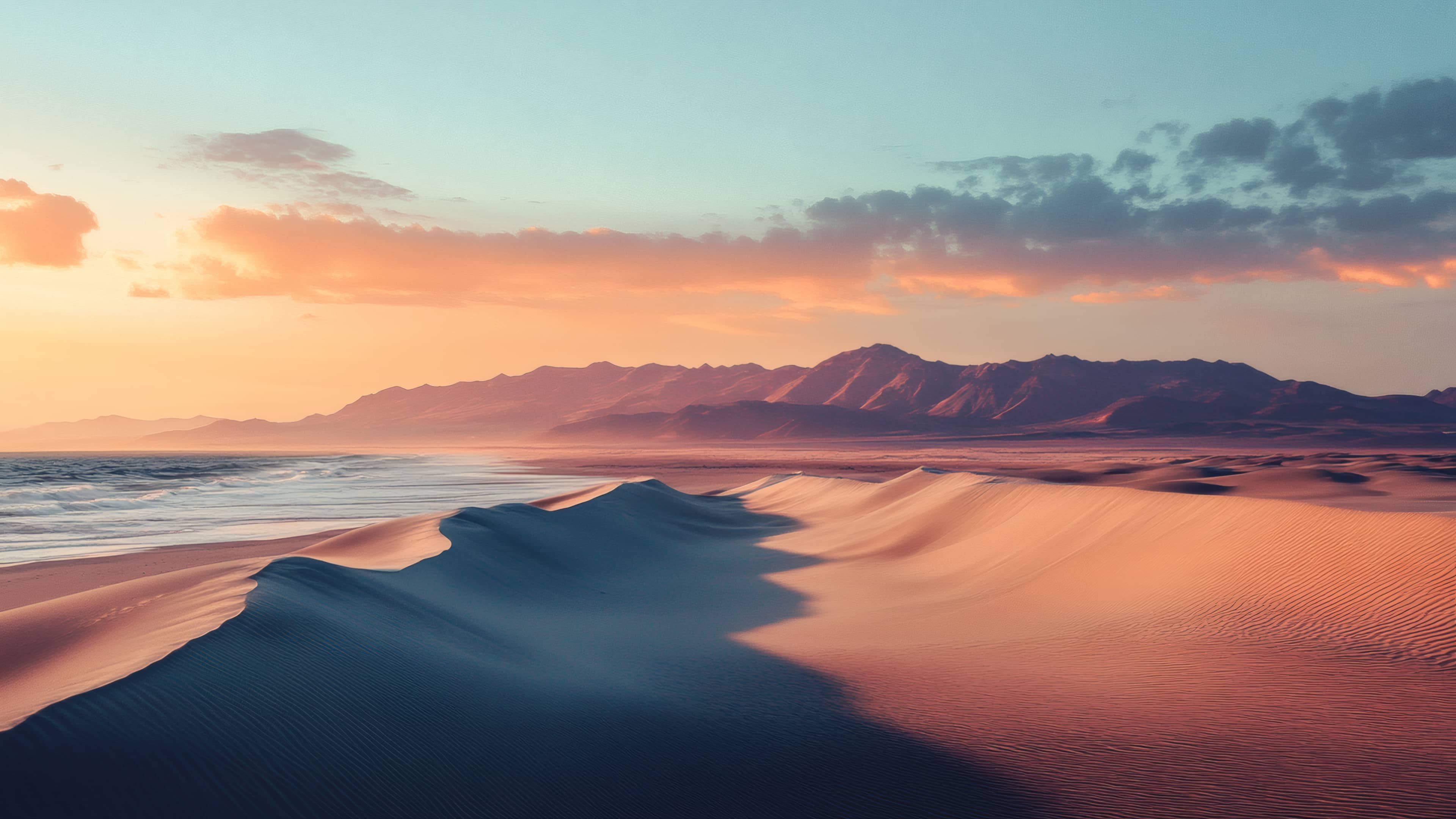 A breathtaking view of coastal sand dunes under the warm hues of a setting sun. The undulating dunes create captivating shadows while meeting the calm, rhythmic waves of the ocean. The distant mountain range and soft clouds complete this serene and picturesque landscape.