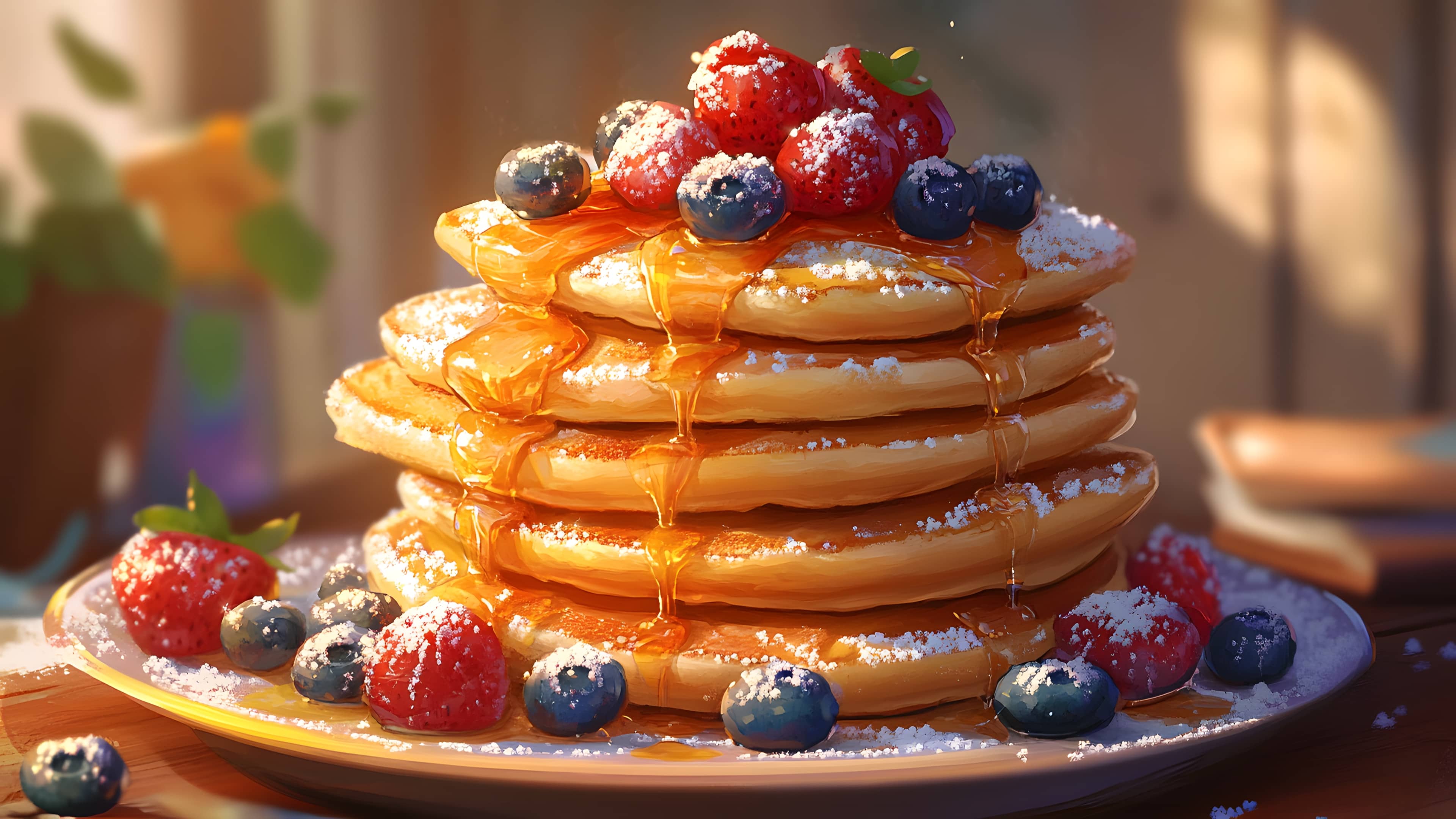 A stack of golden, fluffy pancakes drizzled with warm maple syrup, topped with fresh strawberries, blueberries, and a dusting of powdered sugar. The morning sunlight gently illuminates the cozy breakfast scene, creating a mouthwatering and comforting visual.