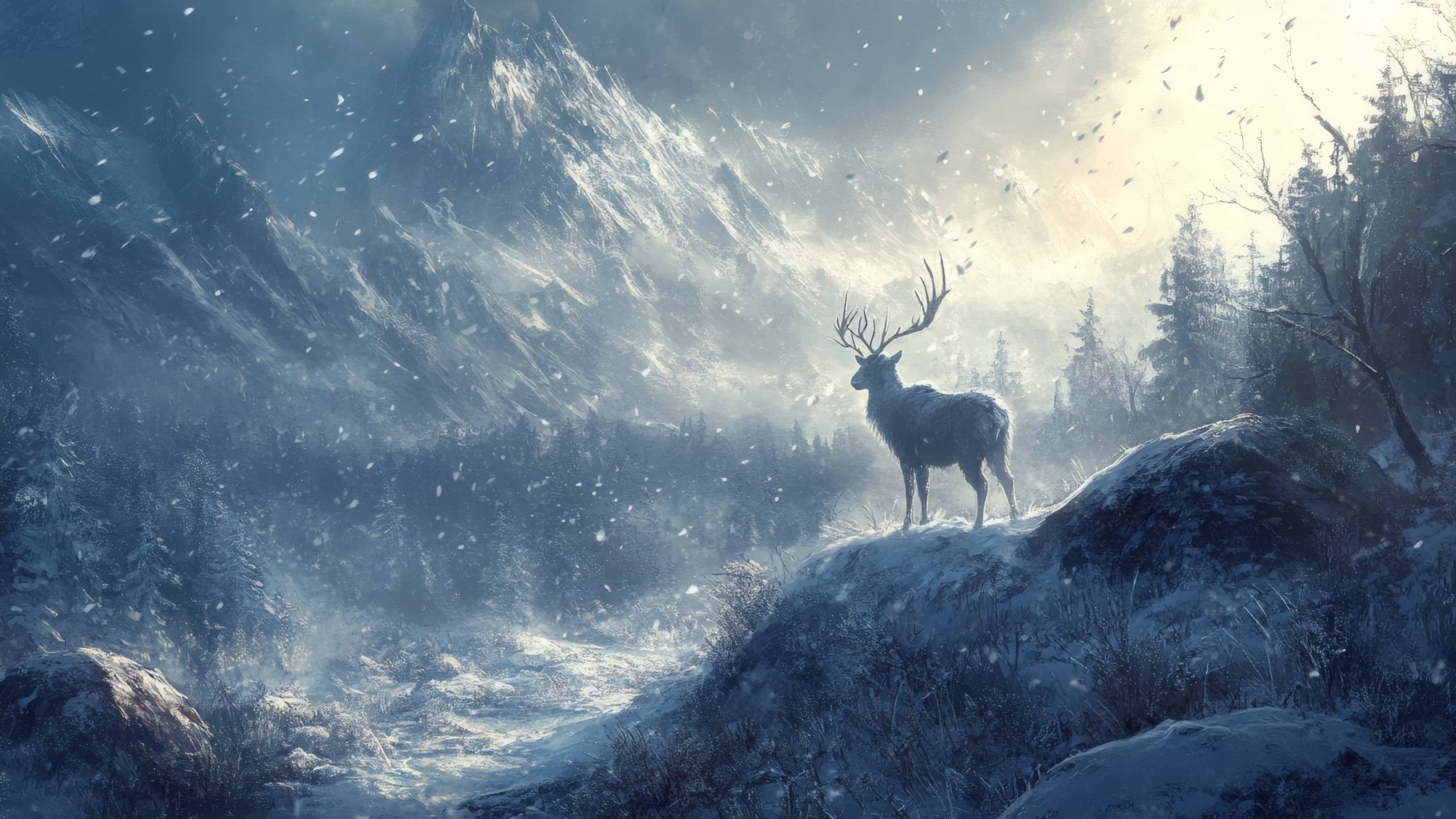 A powerful stag stands proudly on a snowy ridge, overlooking a wintery forest with towering mountains in the background. The scene is filled with softly falling snowflakes, creating a serene yet majestic atmosphere in the heart of nature. The cold, crisp air and the solitude of the wilderness emphasize the stag's grace and strength, embodying the spirit of the untamed wild.