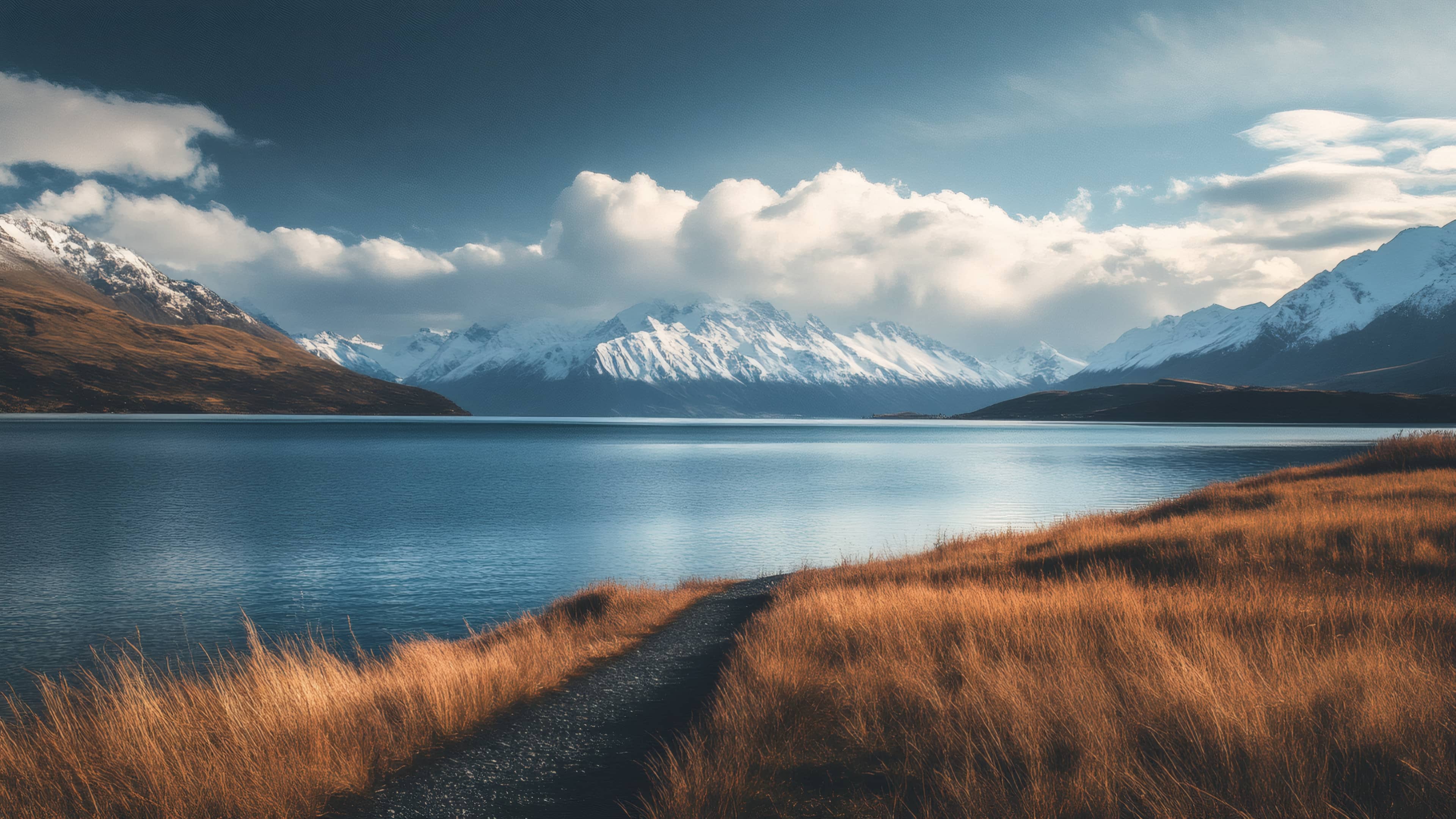 A scenic path winding through golden grass, leading to a calm mountain lake, with majestic snow-capped peaks in the distance under a dramatic sky.