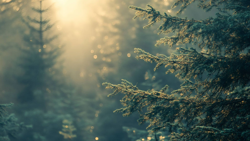 A serene forest scene captured during the golden hours of dawn, with sunlight gently filtering through evergreen trees. The misty atmosphere and soft bokeh lighting evoke feelings of peace and natural wonder, ideal for nature-inspired designs or relaxing backgrounds.