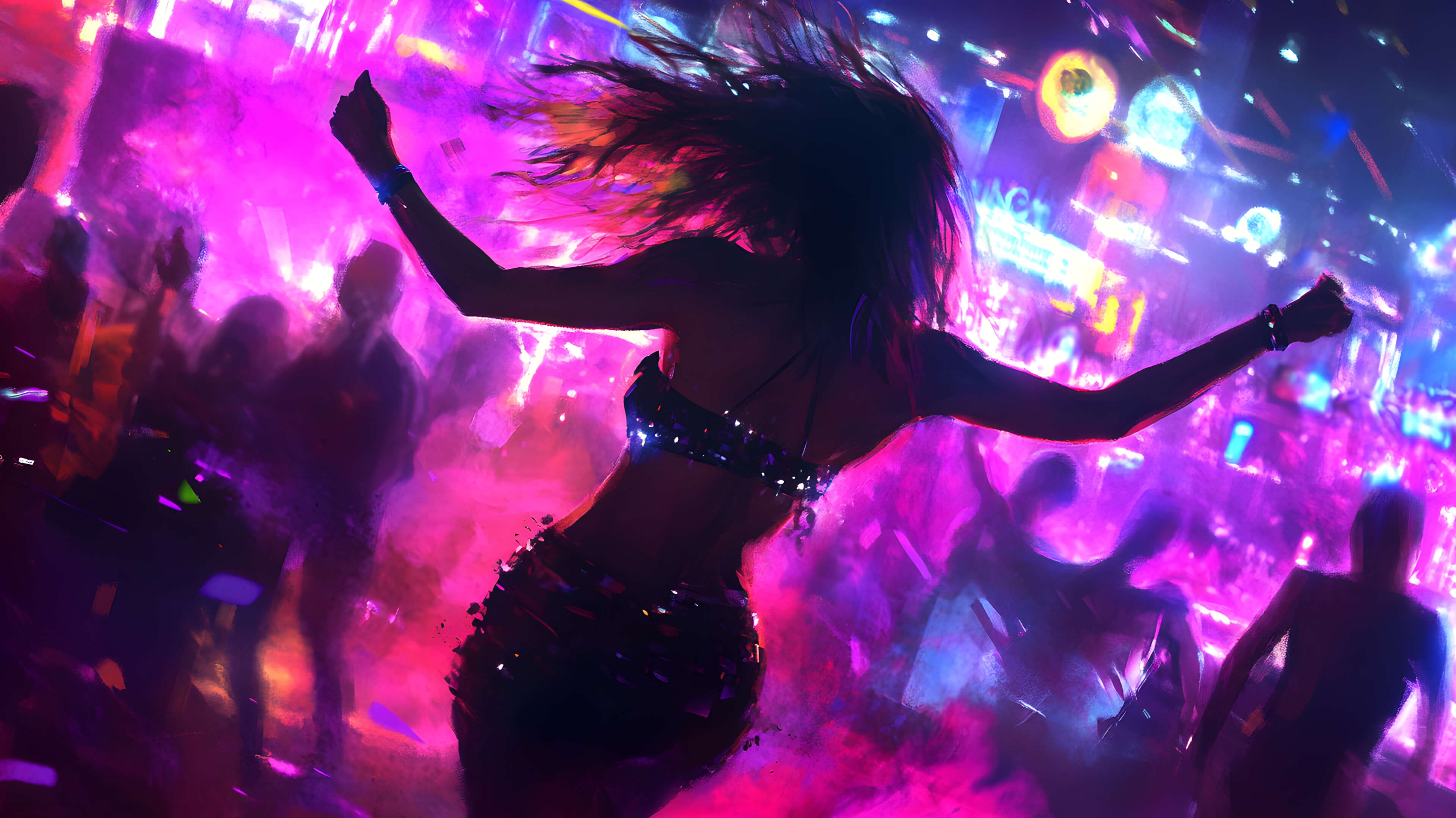 A stunning digital artwork capturing the electrifying energy of a neon-lit dance floor. A silhouette of a woman, immersed in vibrant pinks and purples, moves freely in the heart of the city nightlife. The glowing cityscape and blurred figures evoke a sense of euphoria, rhythm, and celebration.