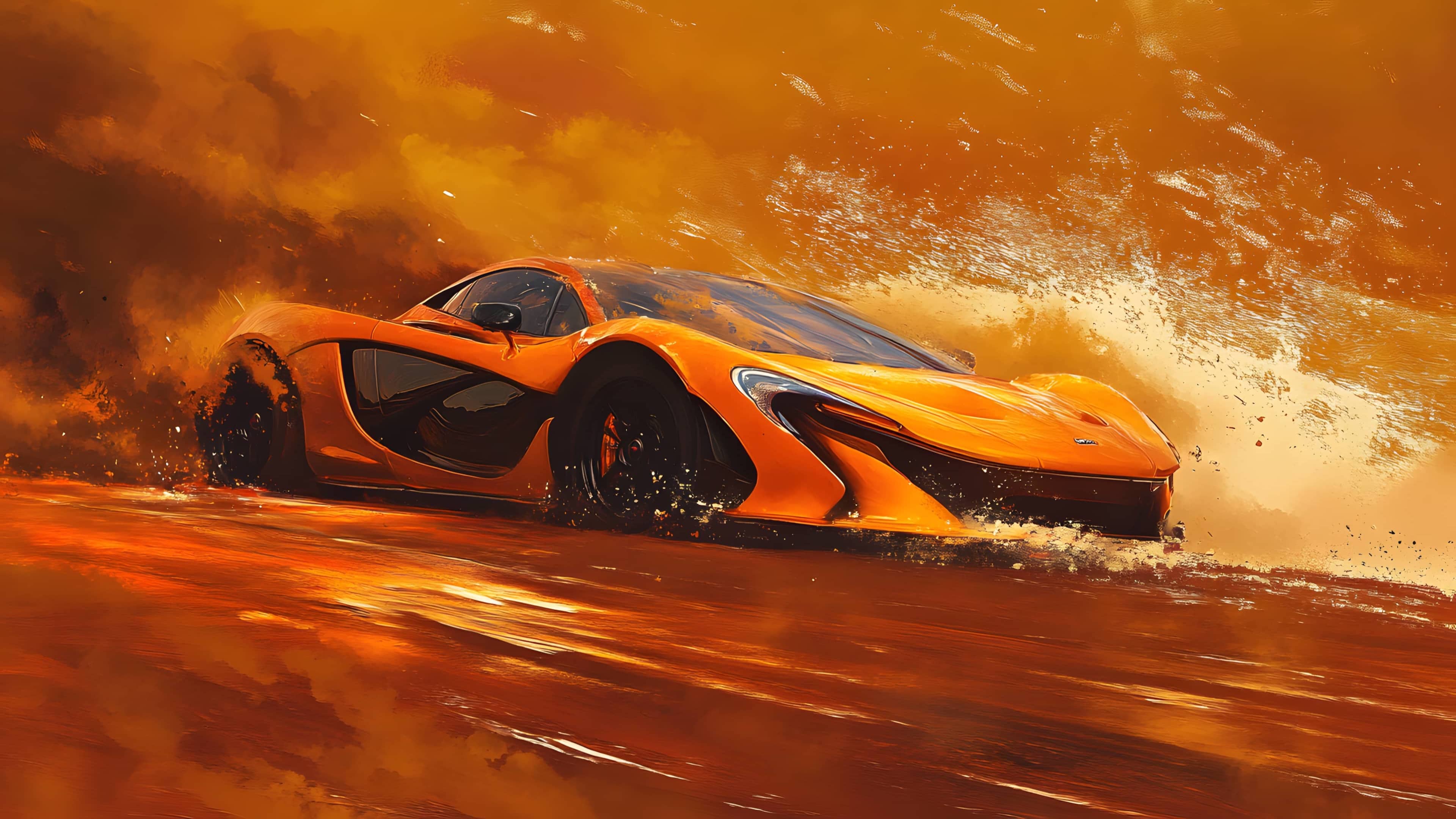 An orange McLaren supercar powers through the desert, kicking up a dramatic cloud of sand and dust. The image highlights the car’s sleek contours, high-speed motion, and luxurious design amidst a vibrant and dynamic desert backdrop.