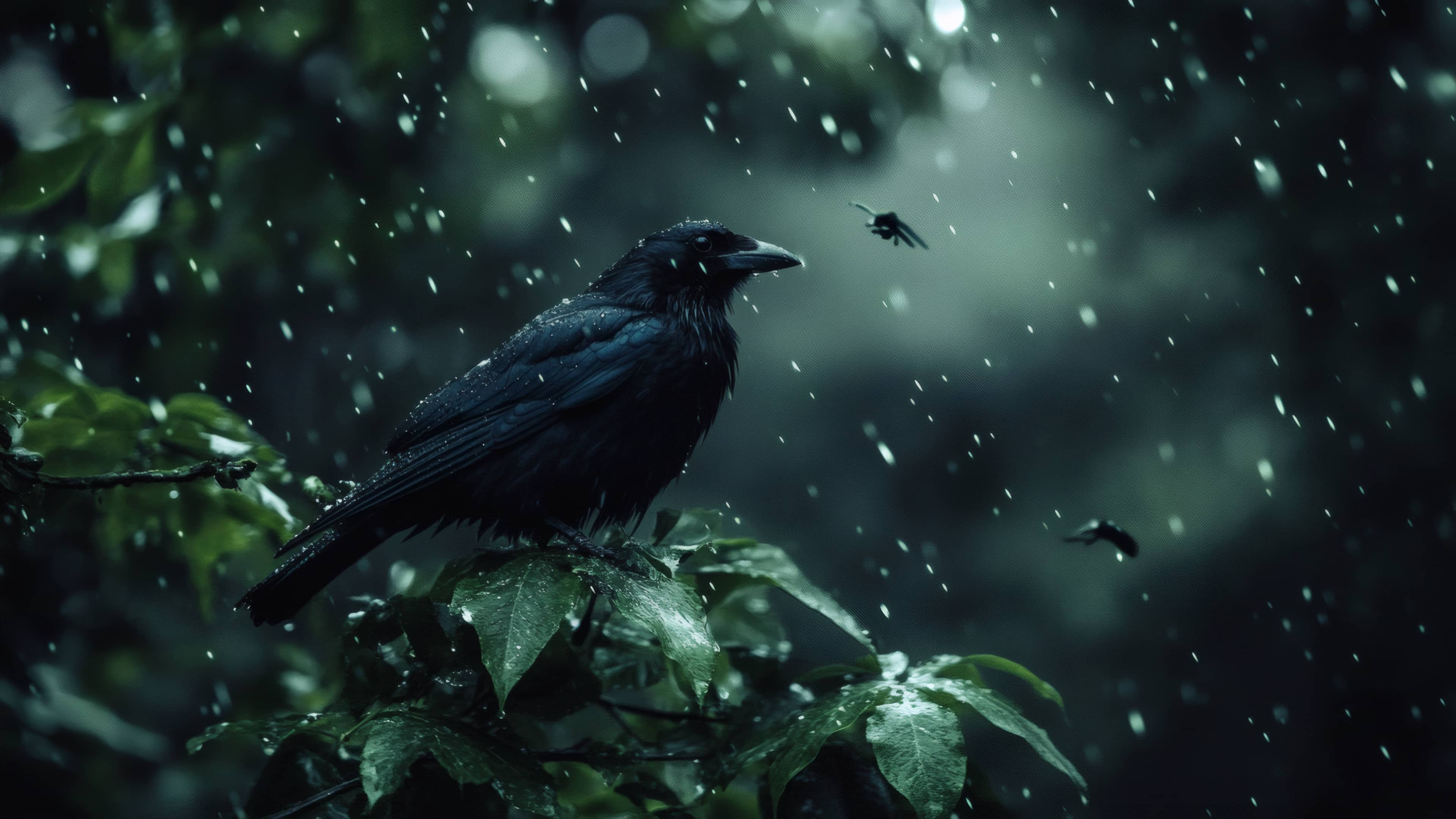 A captivating image of a raven perched on a branch during a downpour. The glistening water droplets on its feathers, surrounded by lush green foliage, create a moody, atmospheric scene symbolizing mystery and nature's raw beauty.