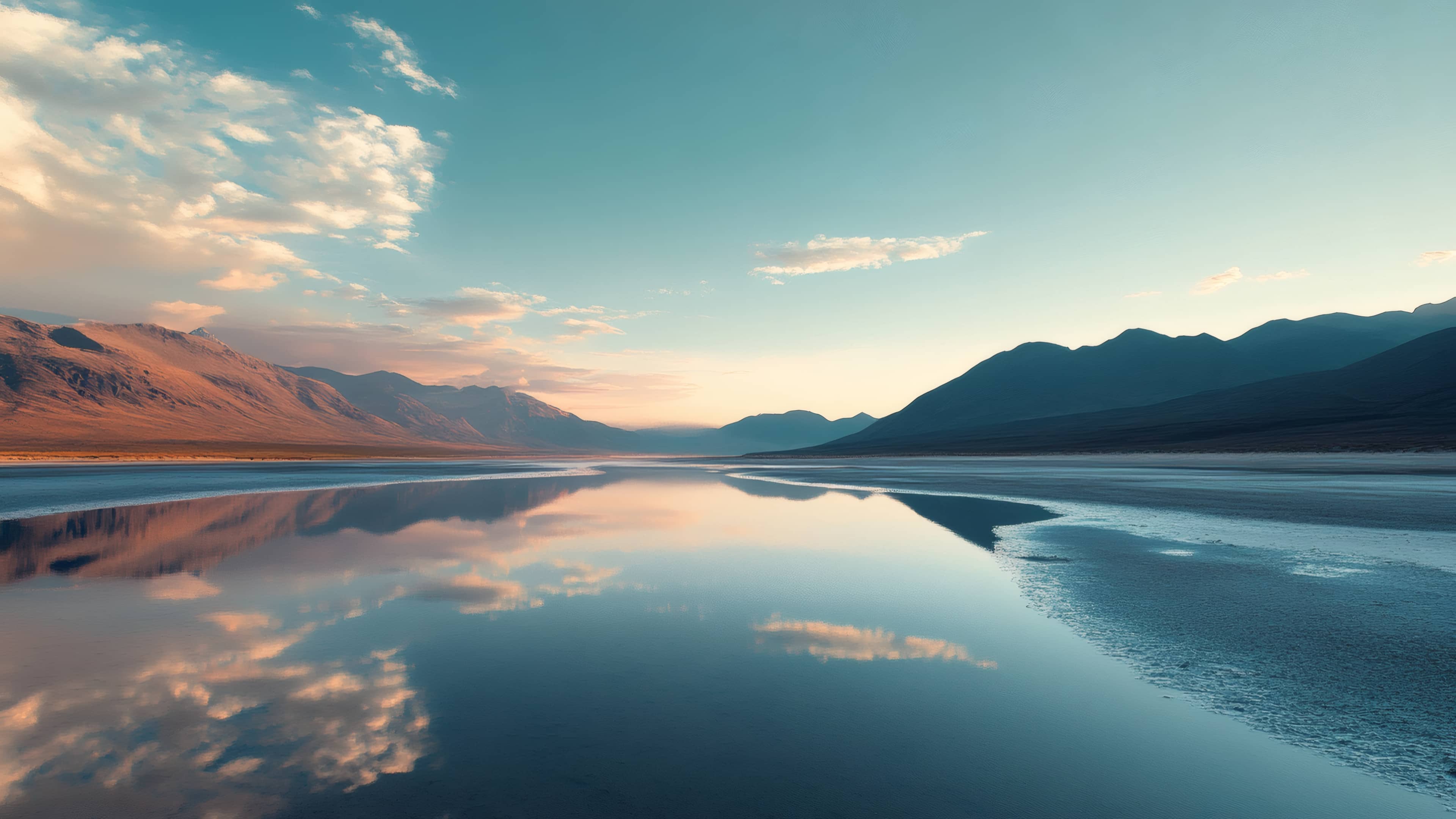 A tranquil landscape featuring majestic mountains reflected perfectly on a calm lake under a soft morning or evening glow, creating a peaceful and scenic view.