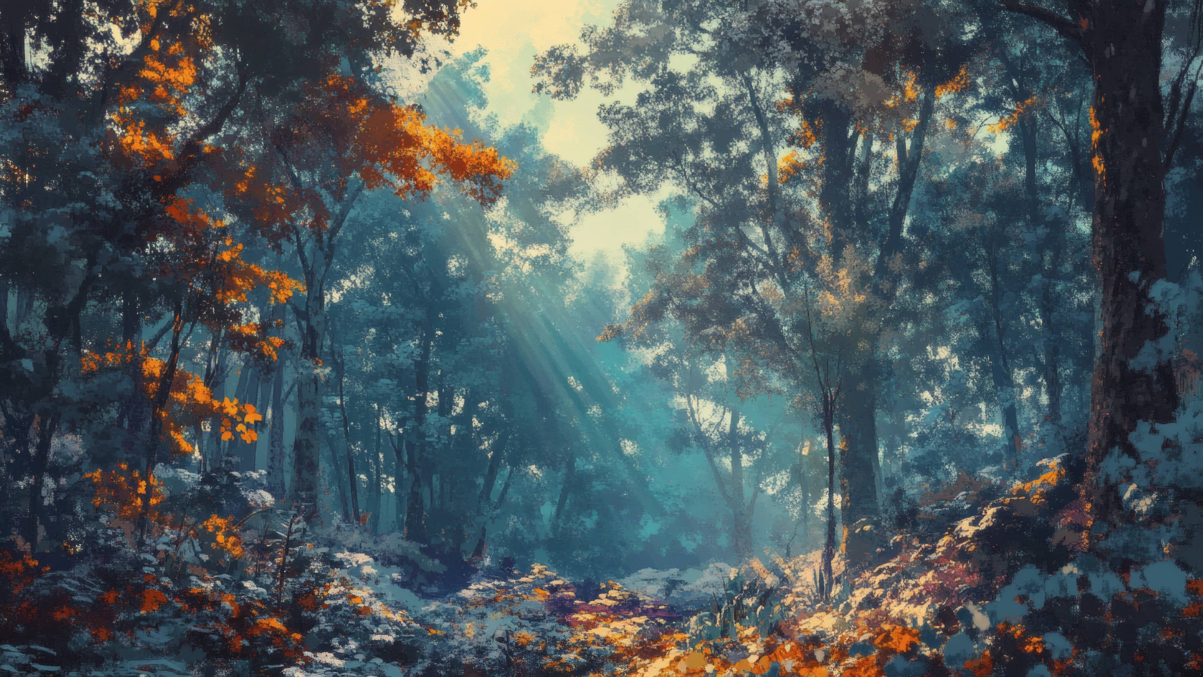 A peaceful forest scene featuring sunlight streaming through the dense canopy, casting golden rays onto the forest floor. The vibrant mix of autumnal oranges, blues, and greens creates a dreamy, painterly atmosphere reminiscent of a fantasy woodland. Gentle shadows and soft light enhance the magic of this serene natural escape.