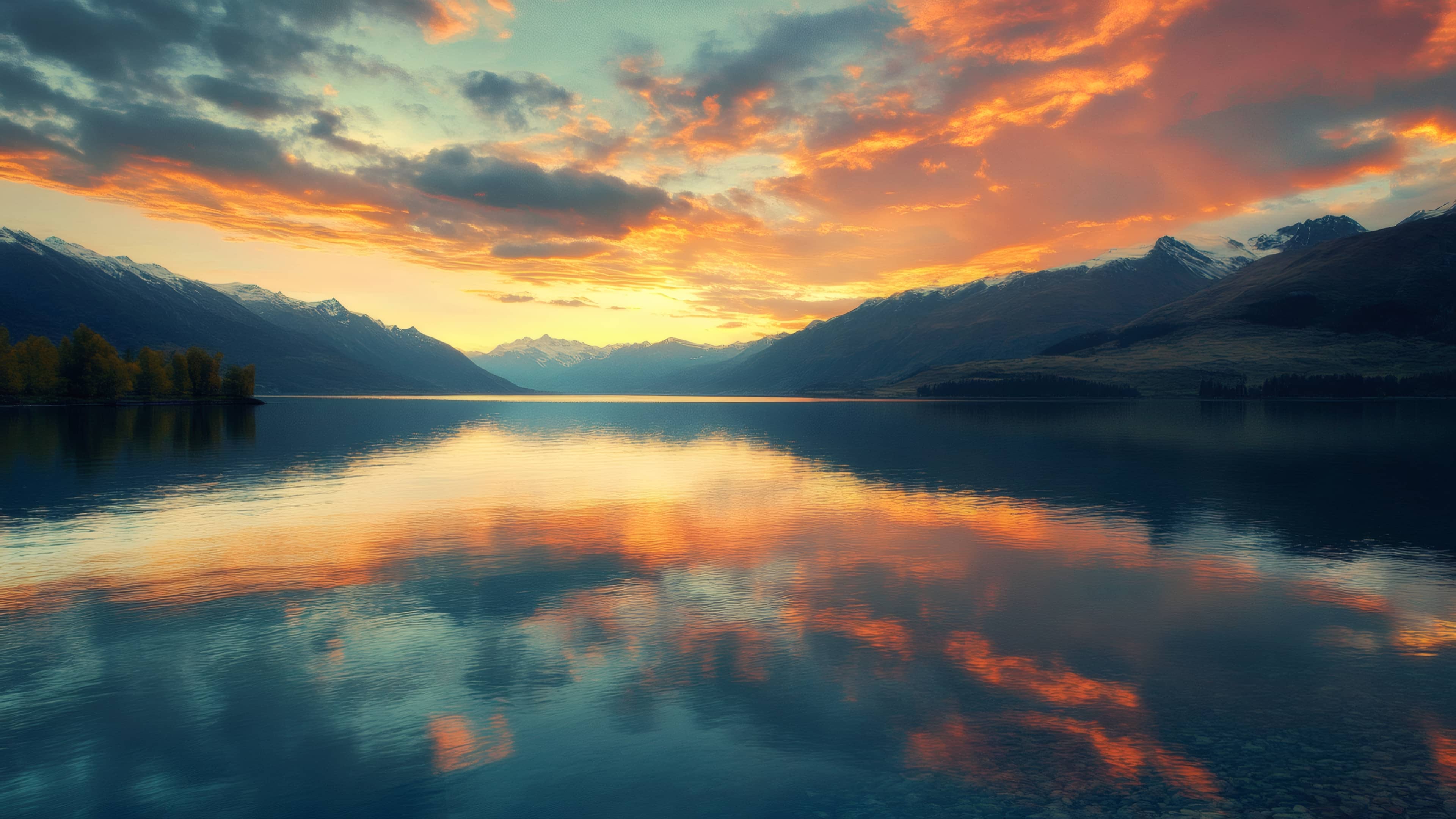 A breathtaking sunset reflecting vibrant orange and pink hues across the calm waters of a mountain lake, surrounded by majestic peaks and autumnal trees along the shore.