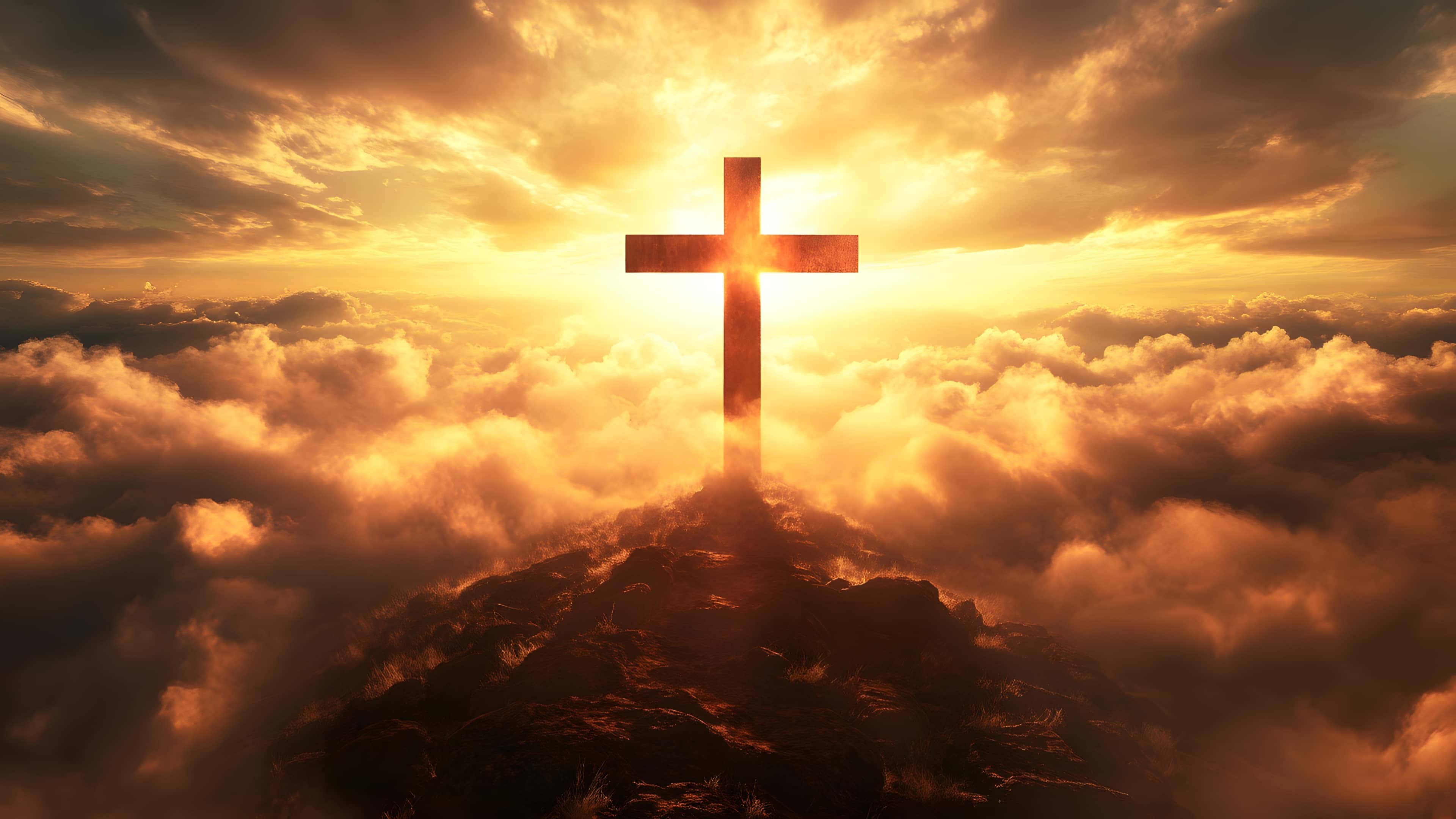A glowing cross stands tall on a rocky hilltop, piercing through clouds illuminated by the warm golden light of sunrise. The radiant sky and heavenly setting symbolize hope, salvation, and the divine power of faith. A serene and uplifting representation of Christian spirituality.
