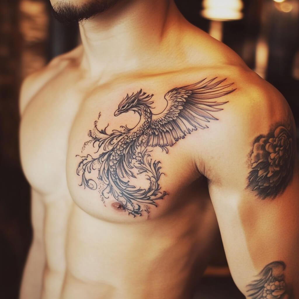 An intricately designed phoenix tattoo graces the upper chest of a man, its wings soaring across the shoulder while swirling feathered flourishes extend beneath. This ornamental black and gray ink piece captures the elegance of the mythical phoenix with fine linework, showcasing a balance of strength and beauty. The tattoo's flow harmonizes with the body’s contours, symbolizing transformation and ascension through delicate artistry.