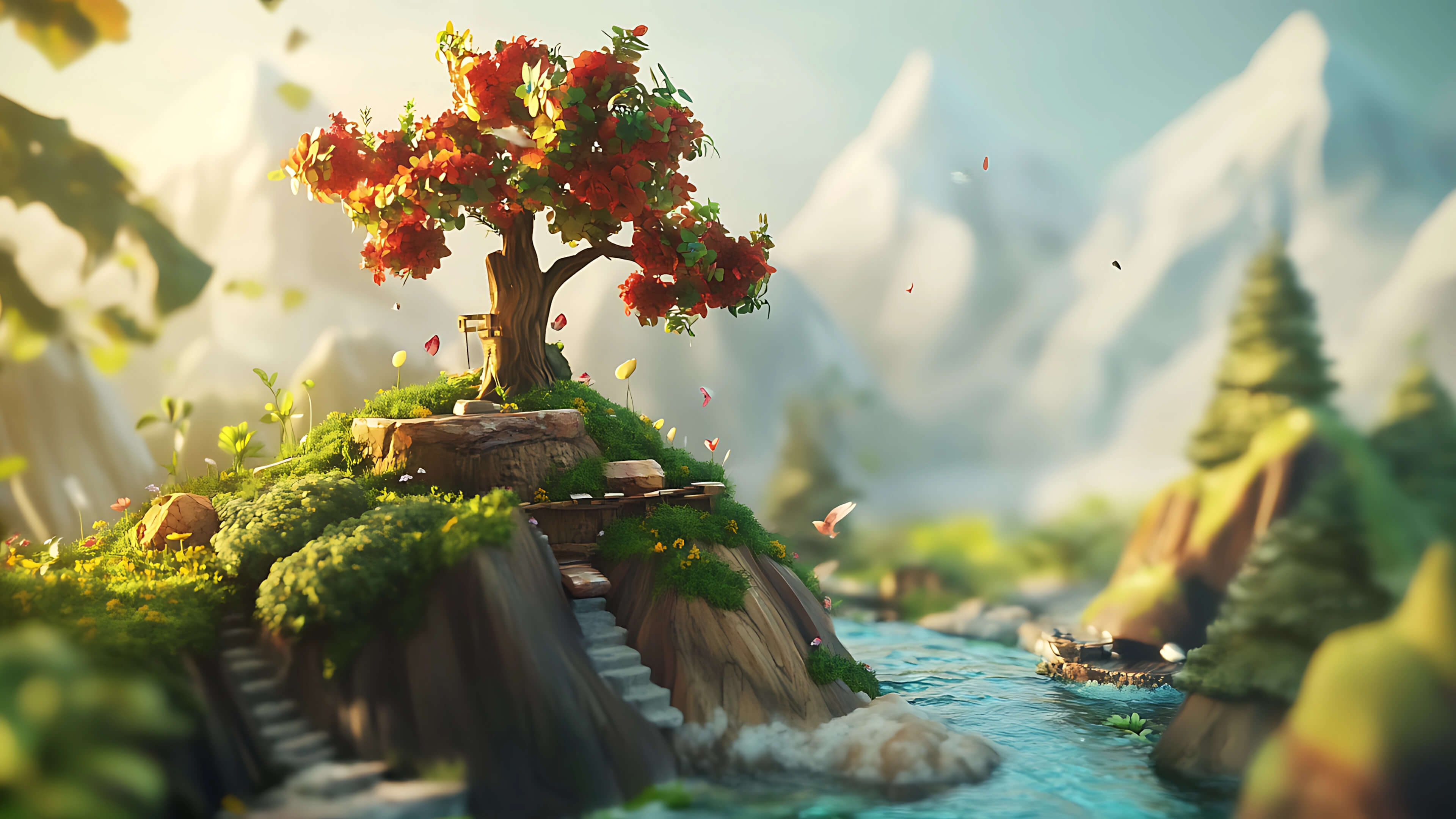 A breathtaking 3D fantasy landscape featuring a vibrant red-leafed tree atop a lush green hill surrounded by flowing water and majestic mountains. Birds and petals drift through the golden light, creating a peaceful, dreamlike atmosphere that evokes balance, beauty, and serenity in nature.