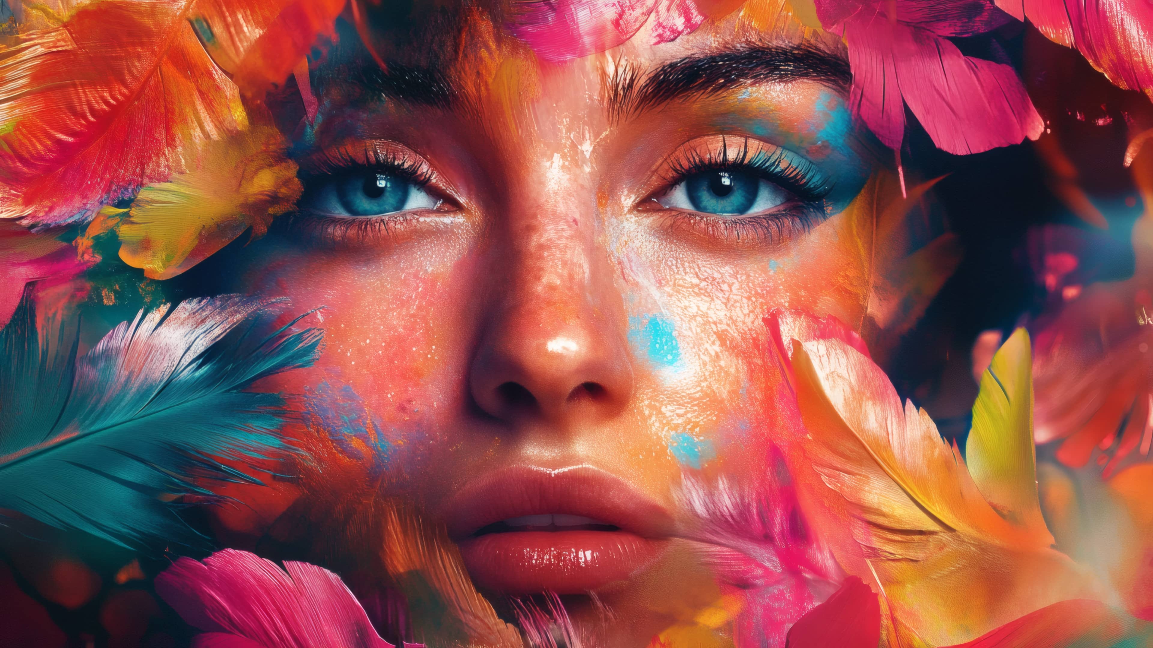 A captivating close-up of a woman’s face surrounded by vibrant feathers and colorful paint splashes, blending art and beauty in a dynamic, expressive composition.