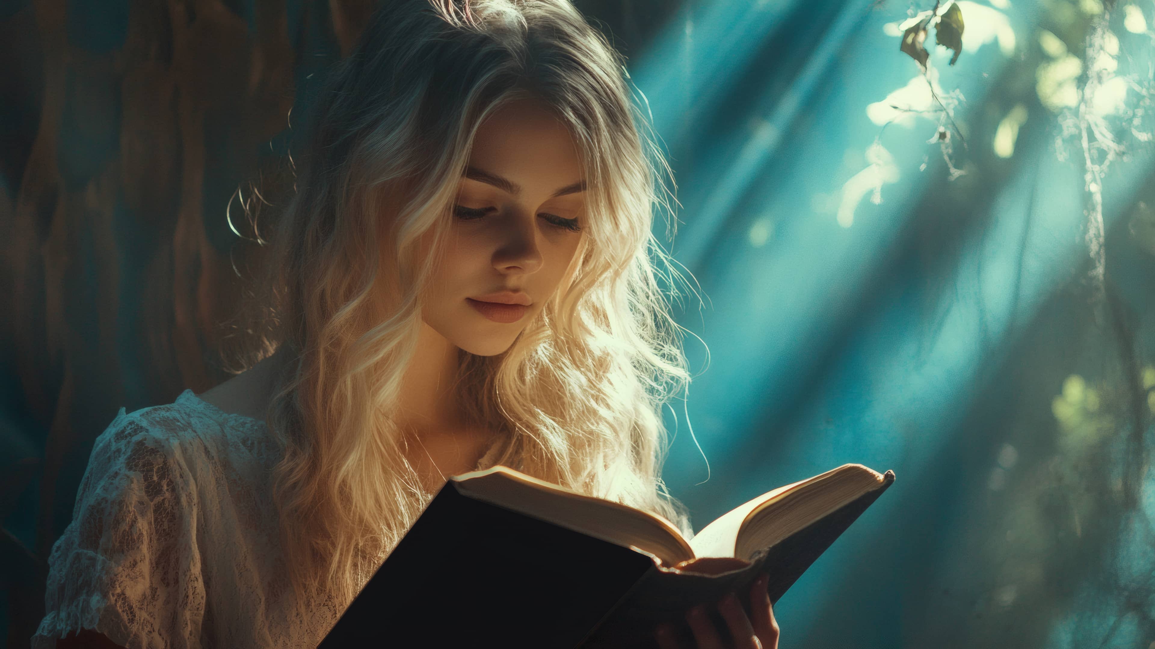 In a serene forest lit by soft beams of sunlight, a young woman engrossed in a book exudes calm and contemplation. Her golden locks glow as the sunlight filters through the leaves, creating a tranquil and magical ambiance. The setting hints at both mystery and knowledge, evoking themes of self-discovery, wisdom, and nature’s quiet embrace.