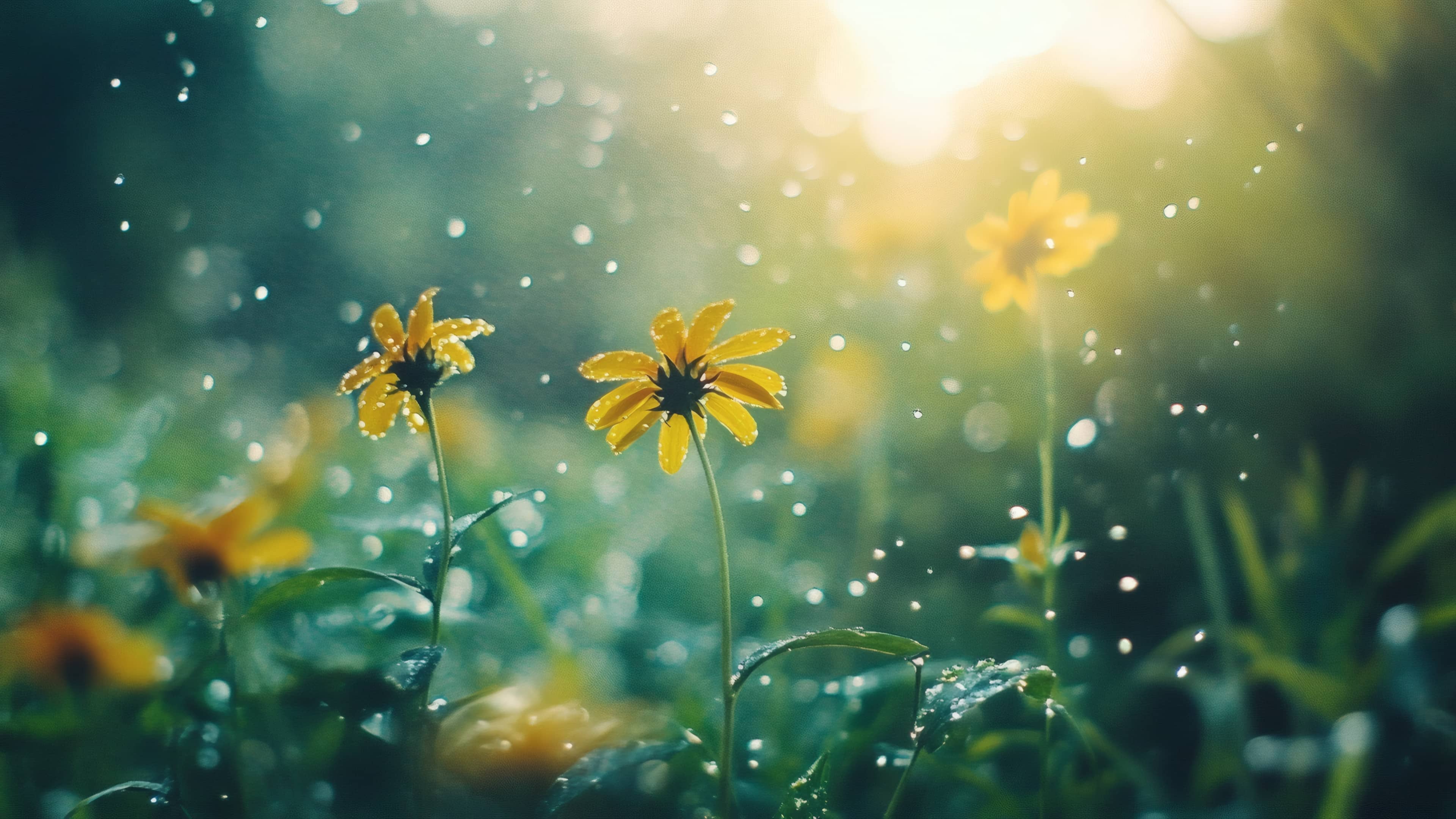 A peaceful scene of blooming yellow wildflowers covered in morning dew, with sunlight filtering through and droplets of water suspended in the air, creating a serene natural ambiance.